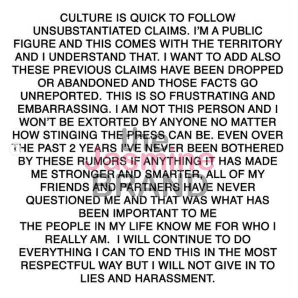 “Culture is quick to follow unsubstantiated claims. I’m a public figure and this comes with the territory and I understand that. I want to add also these previous claims have been dropped or abandoned and those facts go unreported. This is so frustrating and embarrassing. I am not this person and I won’t be extorted by anyone no matter how stinging the press can be.”