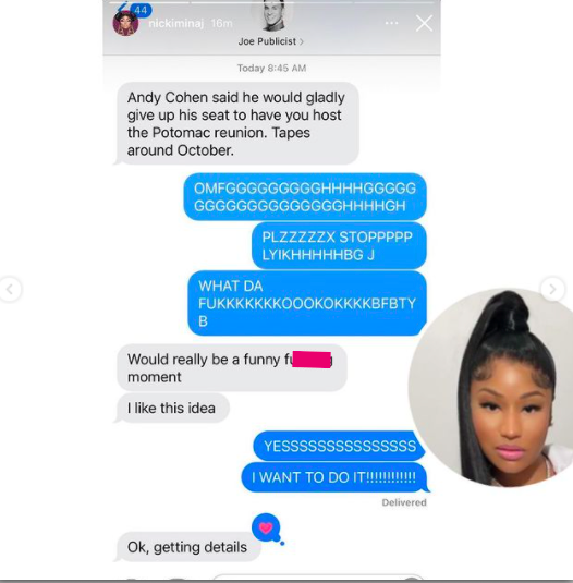 She also uploaded a text exchange with her publicist that confirmed Bravo exec Andy Cohen, who infamously hosts all Housewives reunions, was all for Nicki Minaj stepping in.