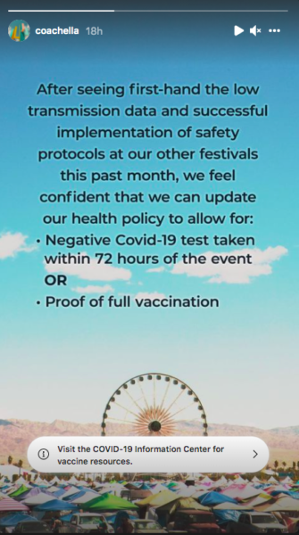 It now seems that Coachella has had a change of heart. On Tuesday (Oct. 13) the official Instagram for the music festival announced it will also accept recent negative COVID test from attendees. A statement released via Coachella’s IG stories said,
