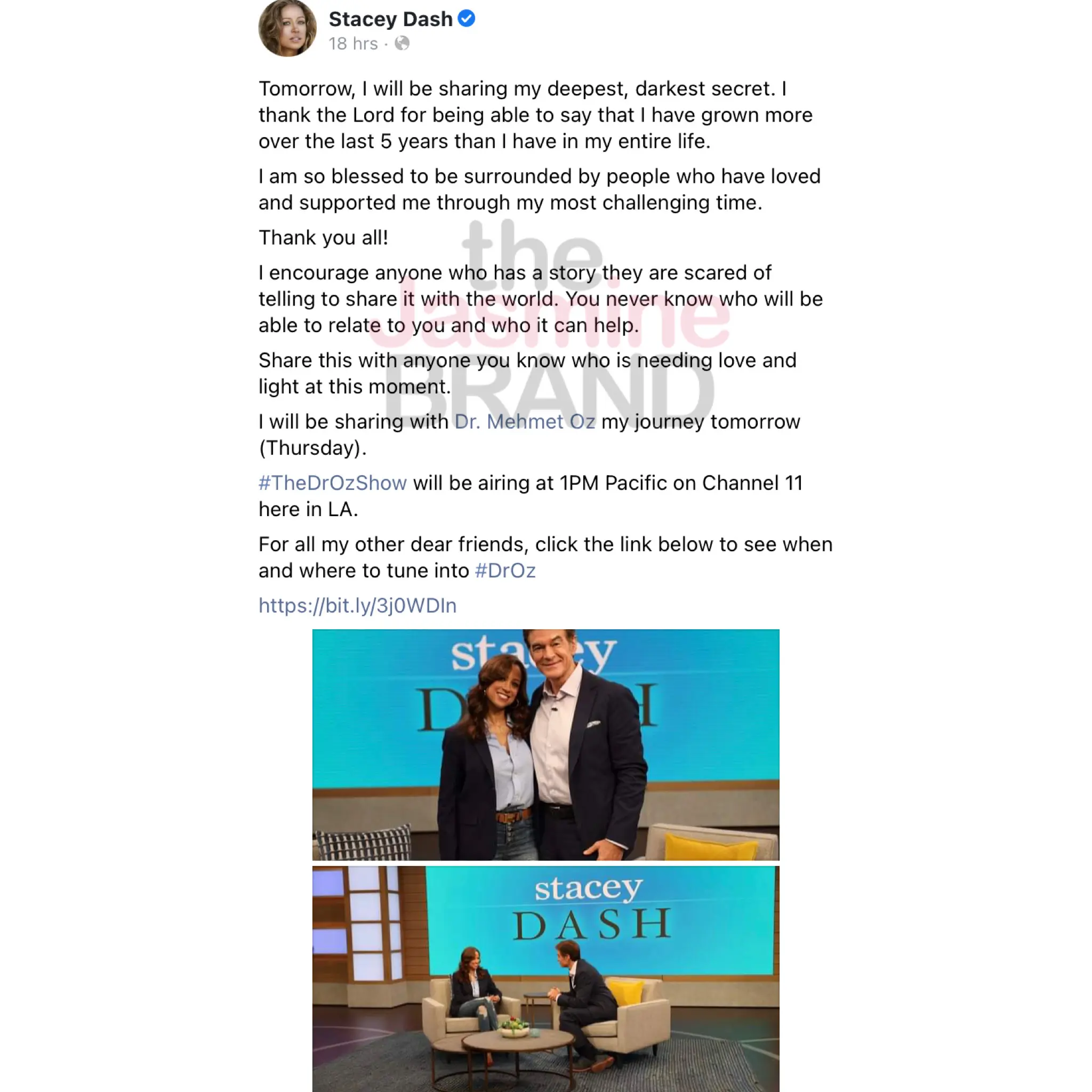 Stacey Dash is opening up about her personal struggle with drug addiction. On an upcoming episode of The Dr. Oz Show, she details her battle.