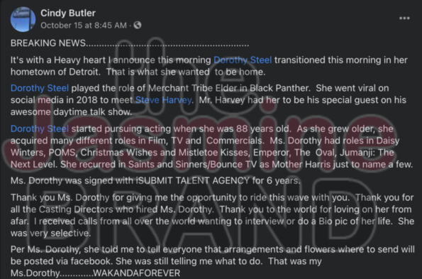 “It’s with a Heavy heart I announce this morning Dorothy Steel transitioned this morning in her hometown of Detroit. That is what she wanted to be home. Thank you Ms. Dorothy for giving me the opportunity to ride this wave with you. Thank you for all the Casting Directors who hired Ms. Dorothy. Thank you to the world for loving on her from afar.”