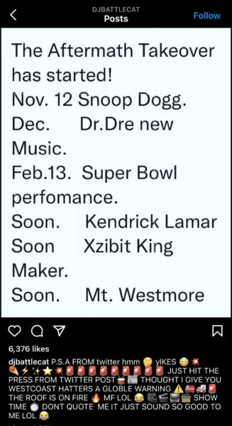 Earlier this month, DJ Battlecat announced the ‘Aftermath Takeover.’ In the post, he shared that new music was on the way from Dr. Dre, Snoop Dogg, Kendrick Lamar, Xzibit, and supergroup Mount Westmore.