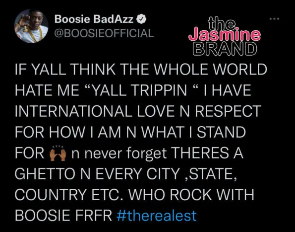 “IF YALL THINK THE WHOLE WORLD HATE ME ‘YALL TRIPPIN’ I HAVE INTERNATIONAL LOVE N RESPECT FOR HOW I AM N WHAT I STAND FOR n never forget THERES A GHETTO N EVERY CITY, STATE, COUNTRY ETC. WHO ROCK WITH BOOSIE FRFR #therealest”