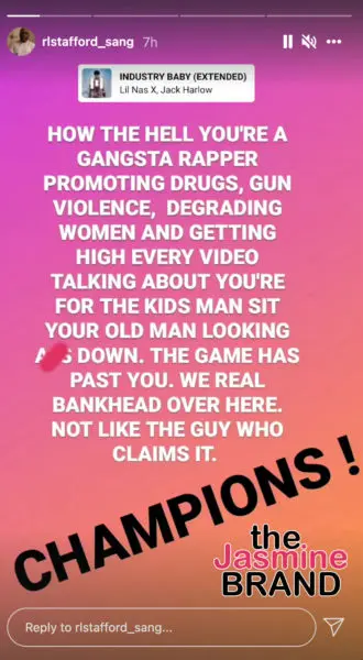“How the h*** you’re a gangsta rapper promoting drugs, guns, violence, degrading women, and getting high every video talking about you’re for the kids man sit your old man looking a** down. The game has past you. We real Bankhead over here. Not like the guy who claims it. CHAMPIONS”