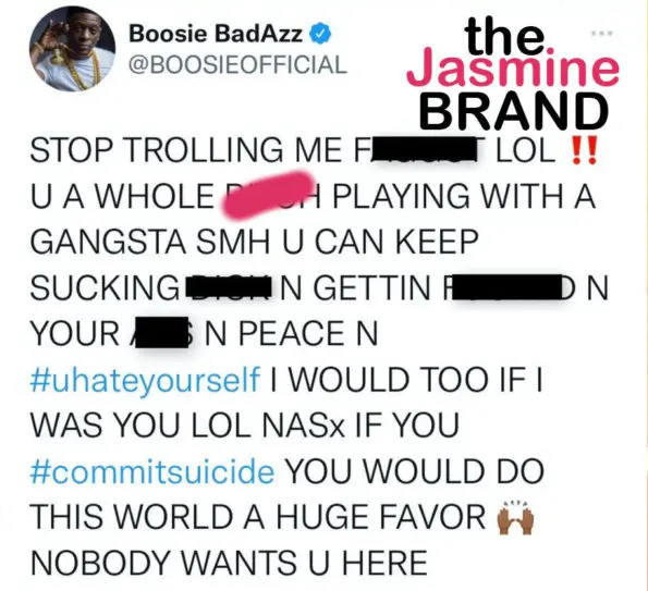 “STOP TROLLING ME F****T LOL!! YOU A WHOLE B***H PLAYING WITH A GANGSTA SMH. YOU CAN KEEP SUCKING D**K AND GETTING F****D IN YOUR A** N PEACE N #uhateyourself I WOULD TOO IF I WERE YOU LOL. NASx IF YOU #commitsuicide YOU WOULD DO THIS WORLD A HUGE FAVOR NOBODY WANTS U HERE.”
