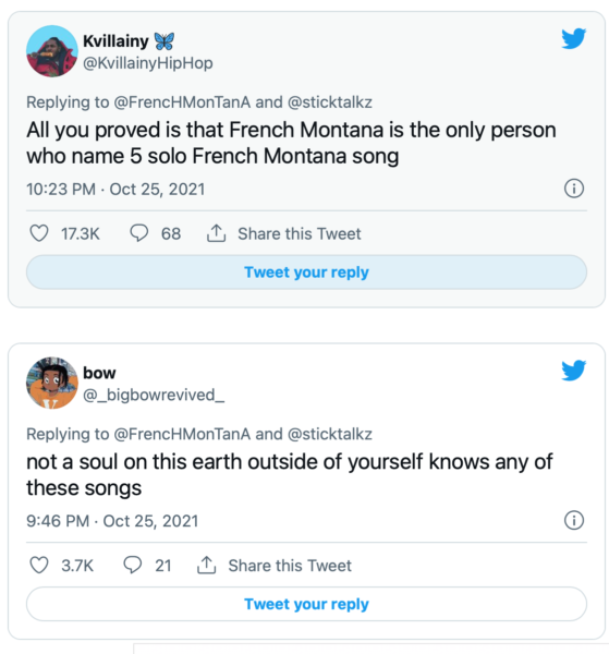 Twitter users in the comments weighed in and many agreed that they couldn’t come up with a French Montana song that has no feature.