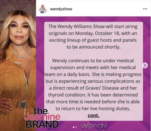 As previously reported, Williams has been unable to return her talk show due to complications from her battle with Grave’s disease and thyroid condition. She was originally set to return on Sept. 20th, but the show’s 13th season has featured guest hosts instead.