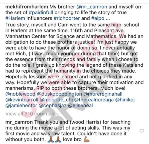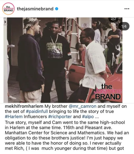 “My brother [Cam’ron] and myself on the set of #paidinfull bringing to life the story of true #Harlem Influencers #richporter and #alpo …True story, myself and Cam went to the same high-school in Harlem at the same time. 116th and Pleasant ave. Manhattan Center for Science and Mathematics. We had an obligation to do these brothers justice!”