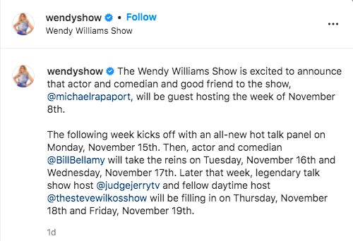 It was recently announced that Michael Rapaport, Bill Bellamy, Jerry Springer, and Steve Wilkos will be filling in for Wendy for the rest of November.