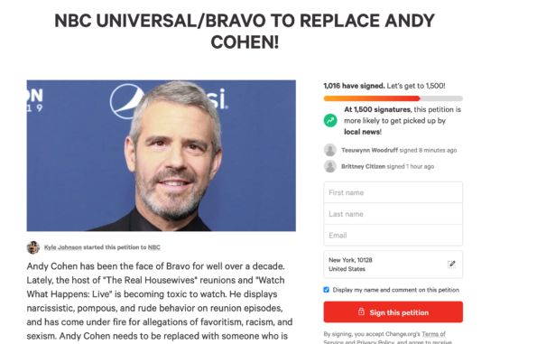 His statements about the cancellation remain unconfirmed, however there is a petition circulating to remove Andy Cohen from Bravo completely. It’s titled, NBC/Universal To Replace Andy Cohen, and it has amassed thousands of signatures.