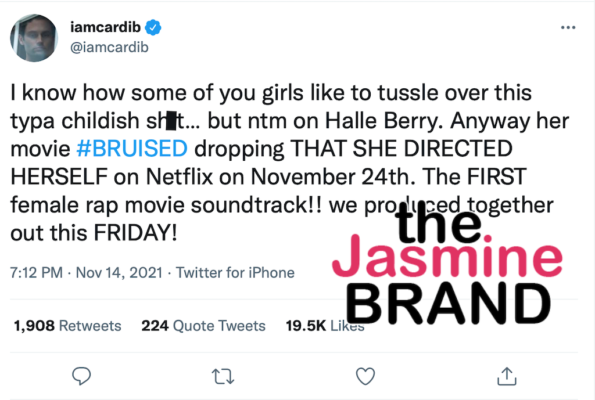 “I know how some of you girls like to tussle over this typa childish sh*t… but ntm on Halle Berry. Anyway her movie #BRUISED dropping THAT SHE DIRECTED HERSELF on Netflix on November 24th. The FIRST female rap movie soundtrack!! We produced together out this FRIDAY!”