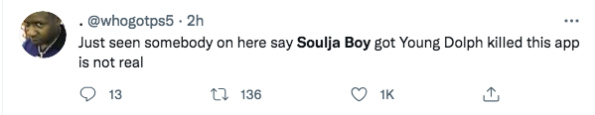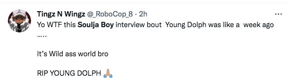Young Dolph has passed away five days after Soulja Boy said this on the Breakfast Club. Not saying this has anything to do with what happen but just crazy how energy works. pic.twitter.com/SYDUYtf9Wr