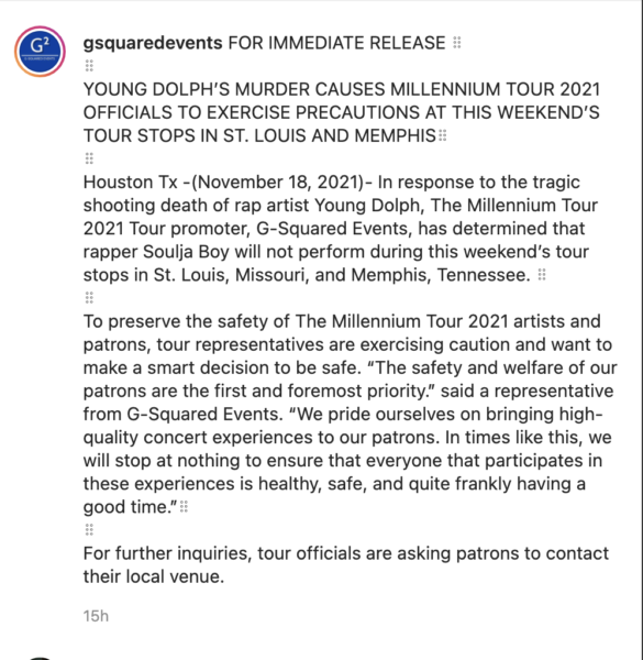 “In response to the tragic shooting death of rap artist Young Dolph, The Millennium Tour 2021 Tour promoter, G-Squared Events, has determined that rapper Soulja Boy will not perform during this weekend’s tour stops in St. Louis, Missouri, and Memphis, Tennessee.”