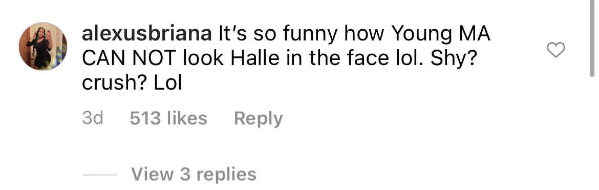 “It’s so funny how Young MA CAN NOT look Halle in the face lol. Shy? Crush? Lol.”