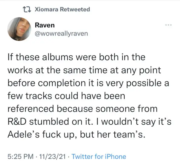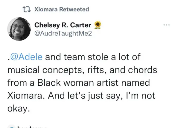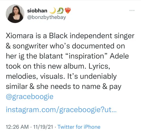 “Xiomara is a Black independent singer & songwriter who’s documented on her ig the blatant “inspiration” Adele took on this new album. Lyrics, melodies, visuals. It’s undeniably similar & she needs to name & pay @graceboogie.”