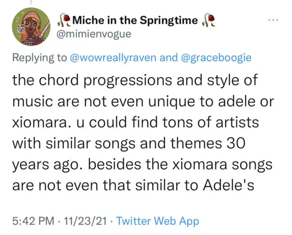 “The chord progressions and style of music are not even unique to adele or xiomara. u could find tons of artists with similar songs and themes 30 years ago. besides the xiomara songs are not even that similar to Adele’s.”