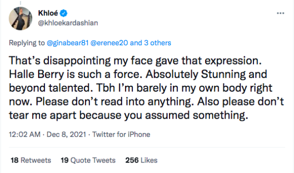 “That’s disappointing my face gave that expression. Halle Berry is such a force. Absolutely Stunning and beyond talented. Tbh I’m barely in my own body right now. Please don’t read into anything. Also please don’t tear me apart because you assumed something.”