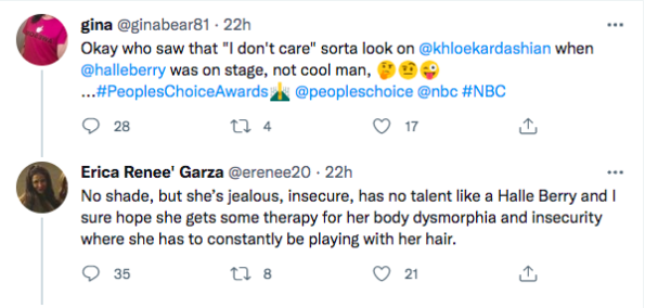 A Twitter user seemingly didn’t like Khloé Kardashian’s body language during Halle Berry’s speech and they tweeted,