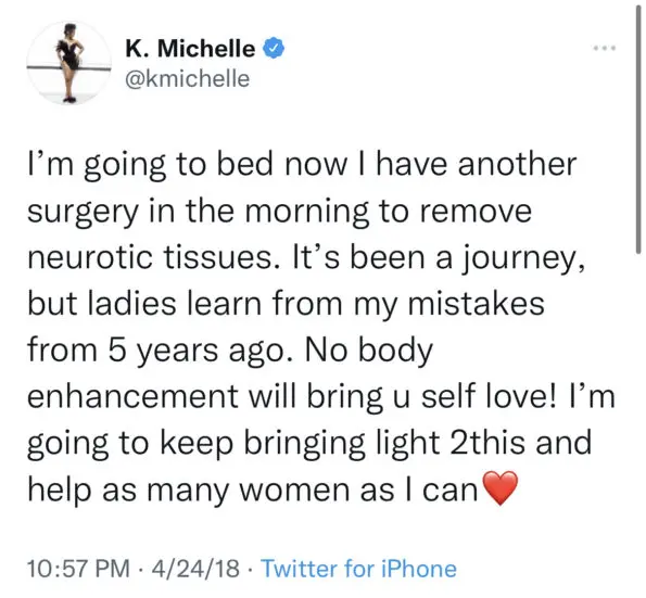 By June 2018, K. Michelle had undergone 4 surgeries to remove dead tissue from her legs. She documented her journey on Twitter, using her story as a cautionary tale. That same year, she partnered with BET and LaLa Anthony to produce Killer Curves: Bodies to Die For, a documentary that chronicled the dangers of implants and injections.