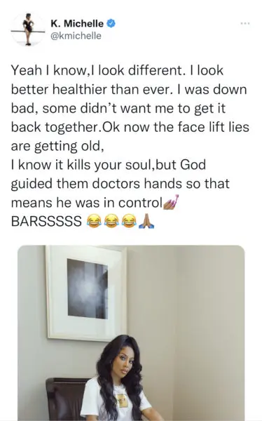 “Yeah I know,I look different. I look better healthier than ever. I was down bad, some didn’t want me to get it back together.Ok now the face lift lies are getting old, I know it kills your soul,but God guided them doctors hands so that means he was in control. BARSSSSS .”