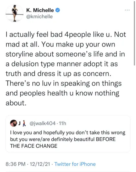 Memphis R&B singer K. Michelle recently responded to a Twitter user who told her that she was beautiful before her alleged facial cosmetic procedures. The fan wrote: