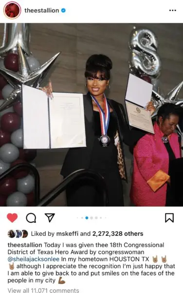 A diploma is not the only honor Megan Thee Stallion received this weekend. She also accepted the 18th Congressional District’s humanitarian award in her hometown of Houston, Texas. Megan took to Instagram to share the good news! She wrote,