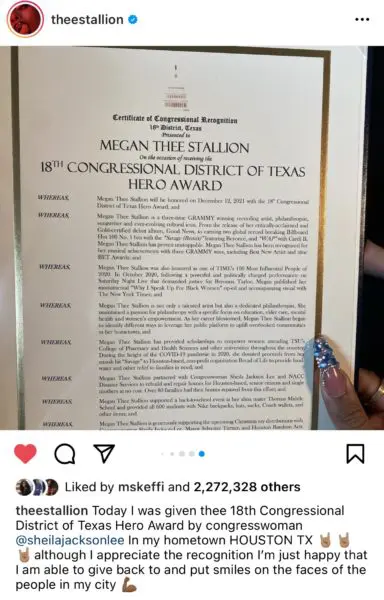 “Today I was given thee 18th Congressional District of Texas Hero Award by congresswoman @sheilajacksonlee In my hometown HOUSTON TX. Although I appreciate the recognition I’m just happy that I am able to give back to and put smiles on the faces of the people in my city.