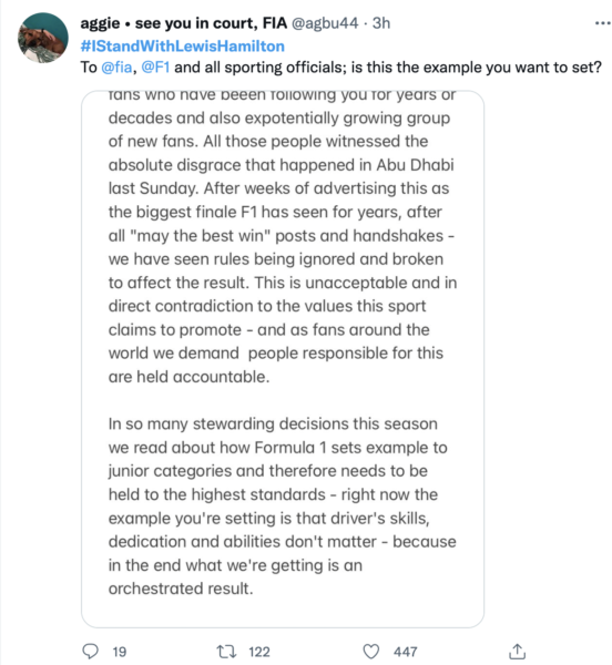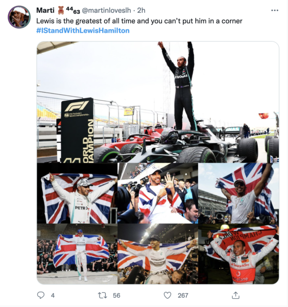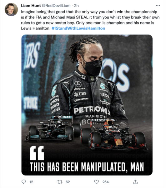 “Imagine being that good that the only way you don’t win the championship is if the FIA and Michael Masi STEAL it from you whilst they break their own rules to get a new poster boy. Only one man is champion and his name is Lewis Hamilton. #IStandWithLewisHamilton.”