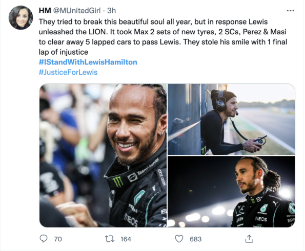“They tried to break this beautiful soul all year, but in response Lewis unleashed the LION. It took Max 2 sets of new tyres, 2 SCs, Perez & Masi to clear away 5 lapped cars to pass Lewis. They stole his smile with 1 final lap of injustice #IStandWithLewisHamilton #JusticeForLewis.”