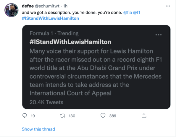 Both Lewis Hamilton and the internet feel like the Mercedes racer was robbed of the title. His fans haven’t let up and have worked overtime to start a full-fledged Twitter campaign. Many have been using the hashtag “I Stand With Lewis Hamilton” in support of their favorite racer. As of today (Dec. 14), the hashtag is trending.