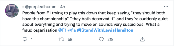 “People from F1 trying to play this down that keep saying “they should both have the championship” “they both deserved it” and they’re suddenly quiet about everything and trying to move on sounds very suspicious. What a fraud organisation @F1 @fia #IStandWithLewisHamilton.”