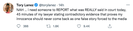 Update #1. Tory Lanez has taken to Twitter, addressing the latest reports about his trial. He wrote on Twitter: