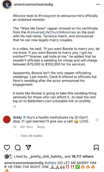Apparently, Diddy caught wind of Bossie’s new talent and is interested in his services! The 52-year-old mogul says he wants Boosie to officiate his wedding. Diddy wrote,