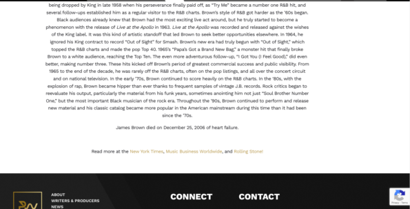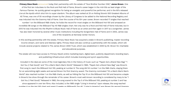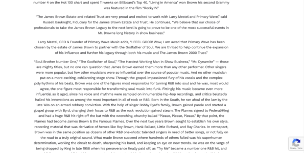 “In this exciting partnership with the estate, Primary Wave Music has acquired a stake in Brown’s publishing, master recording income stream, and name and likeness rights. Primary Wave will also continue a partnership with the estate, which will include several projects related to The James Brown 2000 Trust, which was established in 2000 by Mr. Brown for charitable and educational purposes.