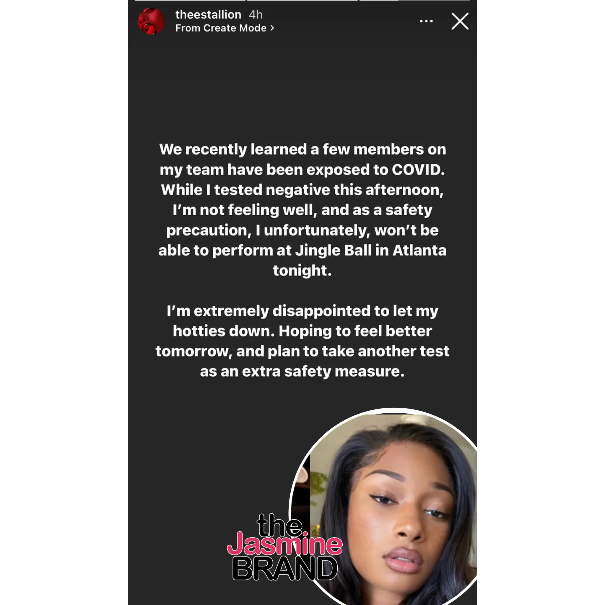 Megan Thee Stallion is the latest artist to potentially be exposed to COVID-19. On Thursday (Dec. 16th), the 26-year-old rapper announced on social media that she had to cancel her appearance at Jingle Ball in Atlanta, Georgia, due to some of her team being exposed to COVID-19.