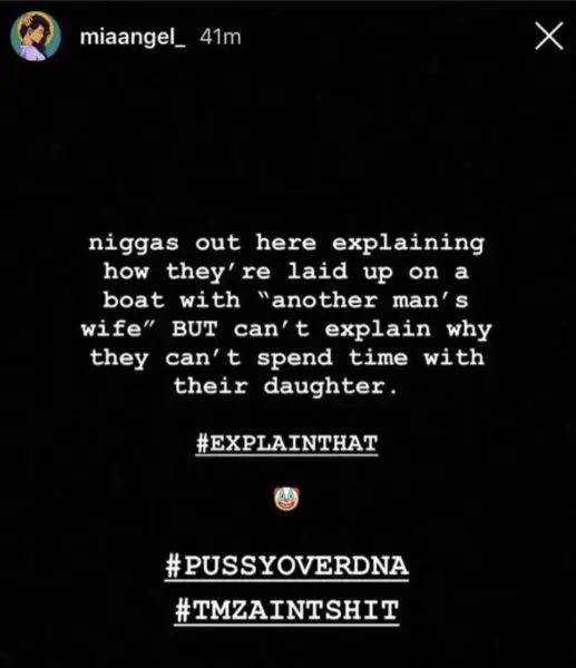 “N***** out here explaining how they’re laid up on a boat with ‘another man’s wife’ BUT can’t explain why they can’t spend time with their daughter. #EXPLAINTHAT #P***YOVERDNA #TMZAINTS***.”
