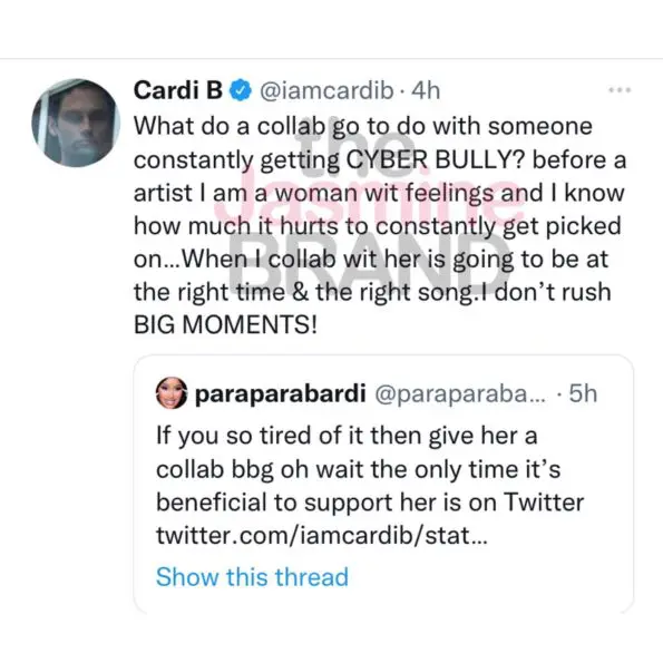 Cardi B responded to the tweet and added,