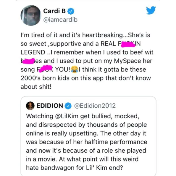One of Cardi’s fans shared an old interview where the New York native spoke on waiting until the “right time” to work with Lil’ Kim. Cardi retweeted the post and said,