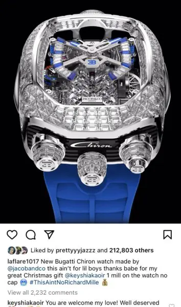 “New Bugatti Chiron watch made by @jacobandco this ain’t for lil boys thanks babe for my great Christmas gift @keyshiakaoir 1 mill on the watch no cap #ThisAintNoRichardMile”