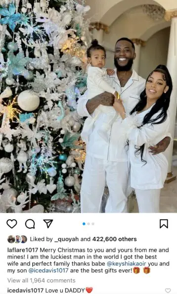 “Merry Christmas to you and yours from me and mines. I am the luckiest man in the world. I got the best wife and perfect family. Thanks babe @keyshiakaoir, you and my son @icedavis1017 are the best gifts ever!”