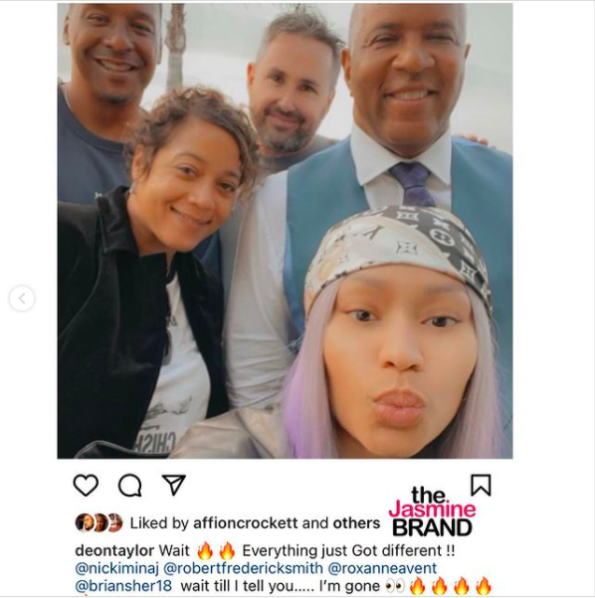 “Wait [2 fire emojis] Everything just Got different !! @nickiminaj @robertfredericksmith @roxanneavent @briansher18 wait till I tell you….. I’m gone [eye emoji] [5 fire emojis]”