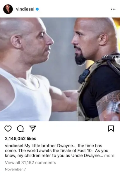Dwayne was referring to an Instagram post that Vin made on Nov. 7. He used an old screenshot of the two from the film they shared and captioned it:
