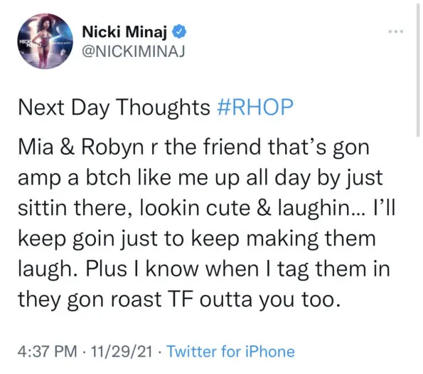 “Next Day Thoughts #RHOP. Mia & Robyn r the friend that’s gon amp a btch like me up all day by just sittin there, lookin cute & laughin… I’ll keep goin just to keep making them laugh. Plus I know when I tag them in they gon roast TF outta you too.”