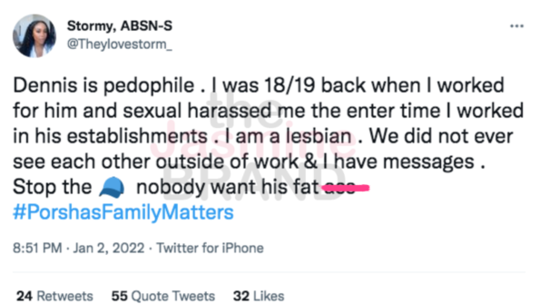“Dennis is [a] pedophile . I was 18/19 back when I worked for him and sexual harassed me the enter time I worked in his establishments. I am a lesbian. We did not ever see each other outside of work & I have messages. Stop the [cap emoji] nobody want his fat a** #PorshasFamilyMatters”