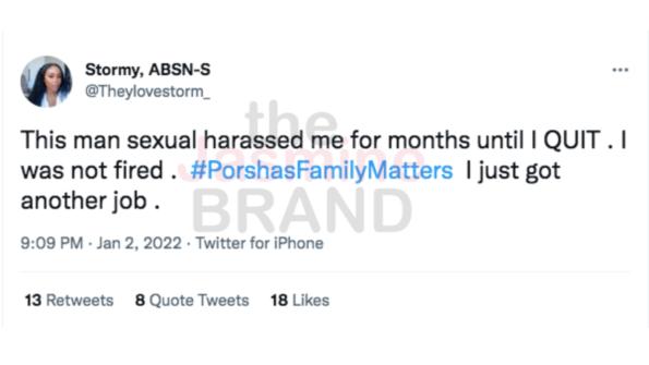 “This man sexual harassed me for months until I QUIT. I was not fired. #PorshasFamilyMatters I just got another job.”
