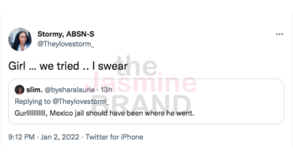 When a Twitter user said that if Dennis physically assaulted her in Mexico then he needed to be in jail, Storm replied,