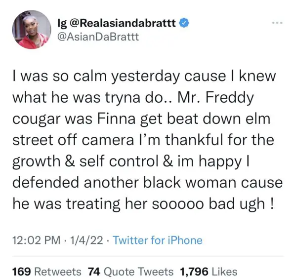 “I was so calm yesterday cause I knew what he was tryna do… Mr. Freddy cougar was Finna get beat down elm street off camera I’m thankful for the growth & self control & im happy I defended another black woman cause he was treating her sooooo bad ugh!”