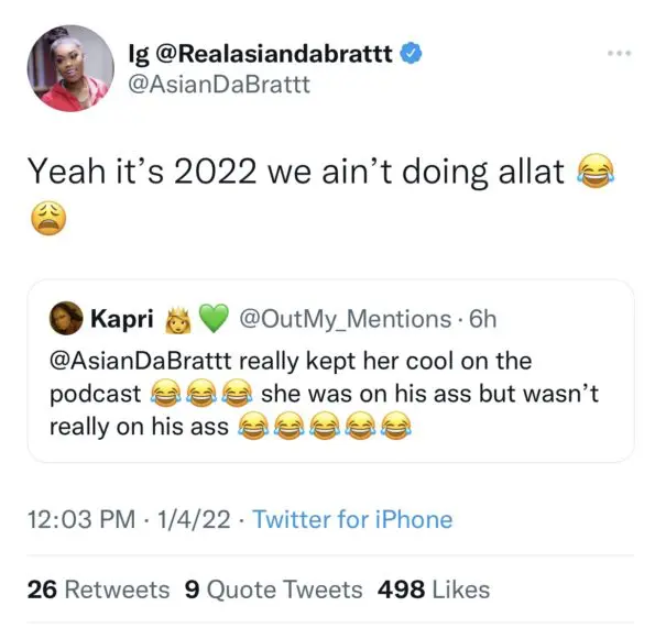 A fan commented on doll’s tweet, applauding the rapper for maintaining her cool during the heated exchange. Asian Doll responded,