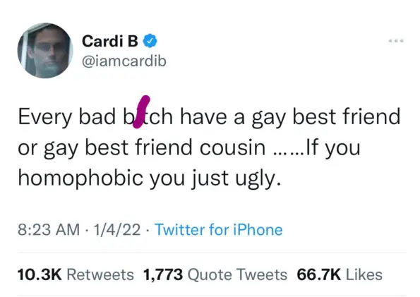 “Every bad b*ch have a gay best friend or gay best friend cousin…. If you homophobic you just ugly.”