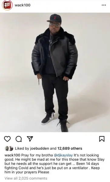 “Pray for my brotha @djkayslay It’s not looking good. He might be mad at me for this those that know Slay but he needs all the support he can get … Been 14 days fighting Covid and he’s just be put on a ventilator . Keep him in your prayers Please.”